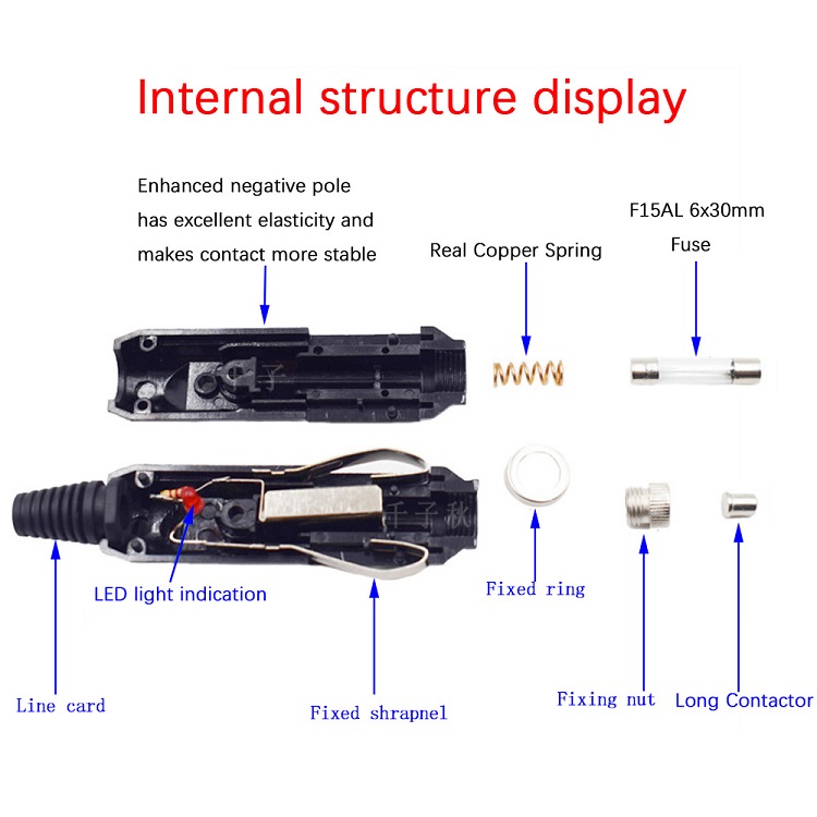 Red LED power indicator light, Replaceable internal 15A fuse.