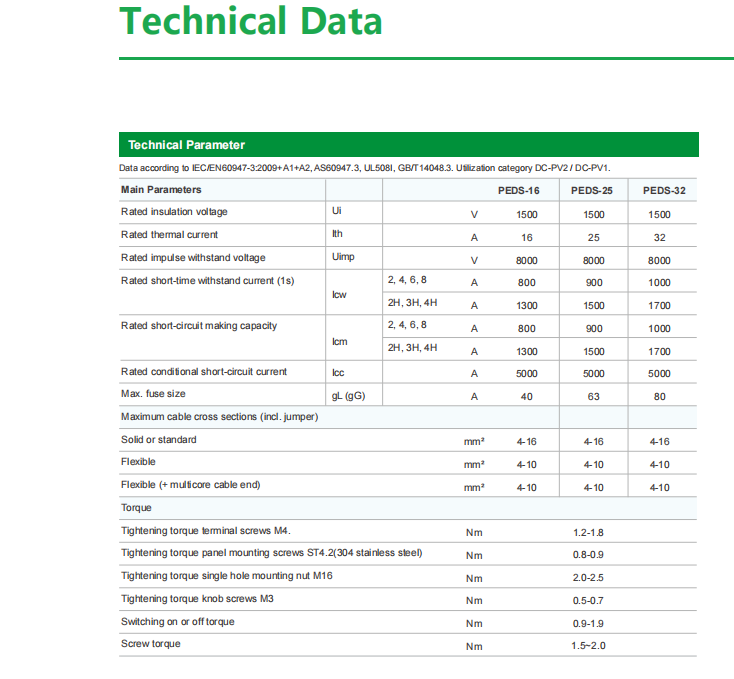 · Designed with a rated insulation voltage of 1500V, it has passed the IEC/EN60947-3:2009+A1+A2, AS60947.3, UL508I test and many international certifications such as TUV, CE, CB, SAA, UL, etc.