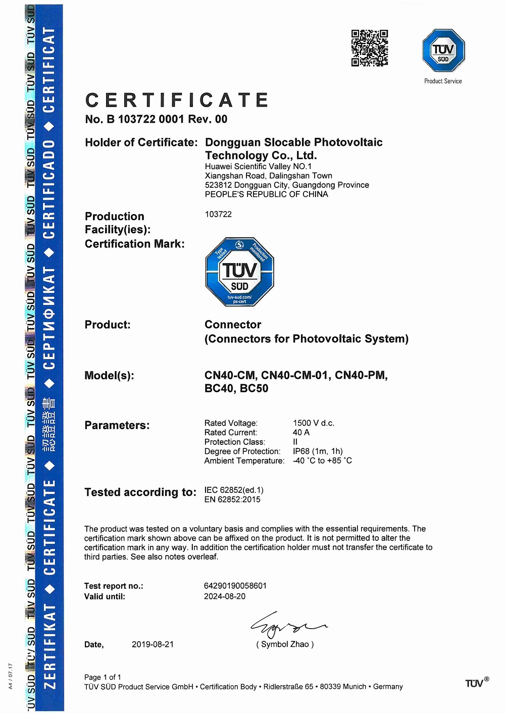 Slocable has got the newest TUV 1500V certificate (IEC62852 and EN62852) for MC4 connectors .