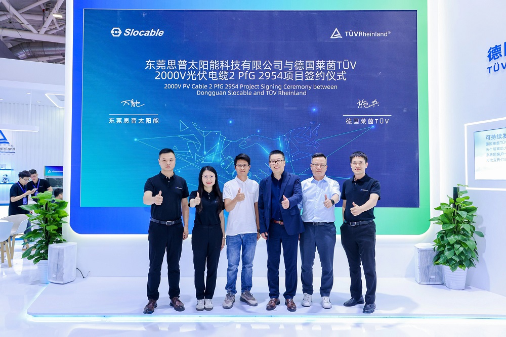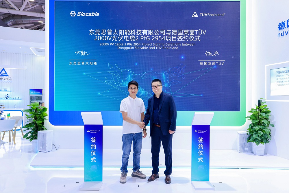 Recently, during the 17th Shenzhen International Battery Technology Exchange Conference/Exhibition (CIBF 2025), TÜV Rheinland signed a cooperation agreement on the 2000V photovoltaic cable certification project with Dongguan Slocable Solar Technology Co., Ltd. The project is based on TÜV Rheinland Standard 2 PfG 2954/10.23 and aims to promote the quality improvement of photovoltaic cable products and the high-quality development of the industry. Mr. Shi Bing, General Manager of Solar and Commercial Product Service Components Business of TÜV Rheinland Greater China, and Mr. Wan Neng, Manager of Slocable Solar, attended the signing ceremony.