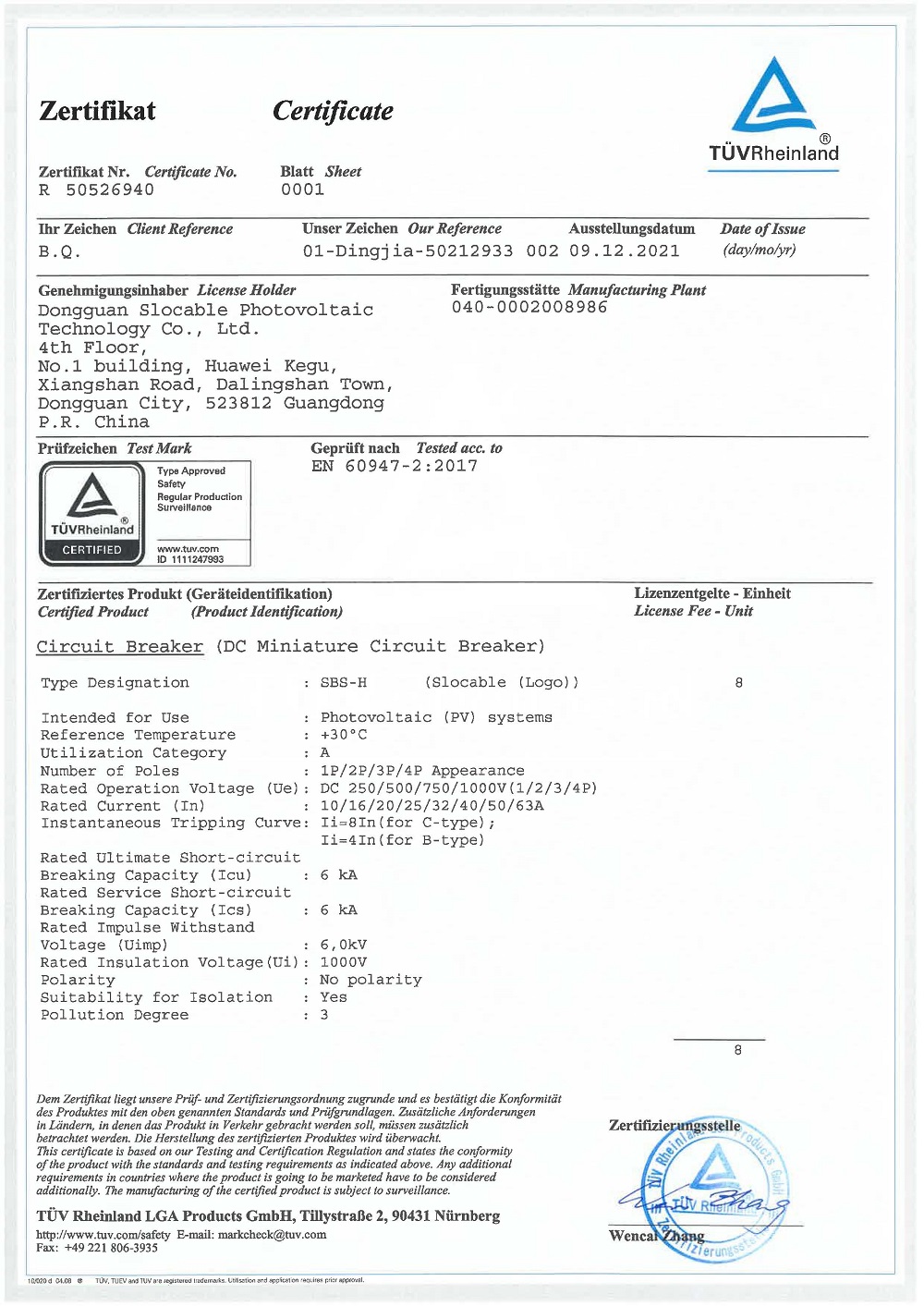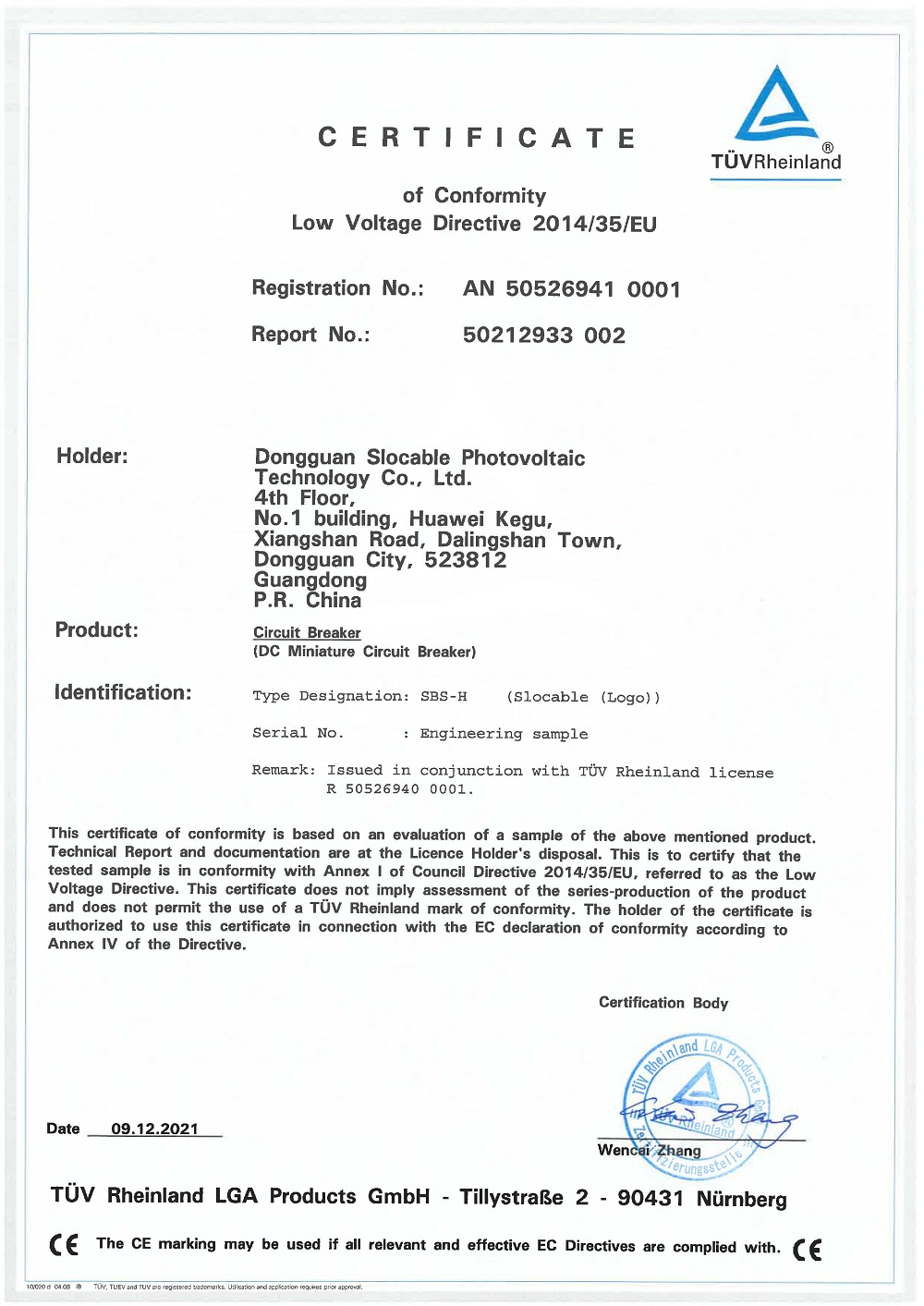 Slocable was established in 2008. After 14 years of continuous development and innovation, Slocable has become a leading manufacturer of solar energy products in China. At present, our company has successfully applied for TUV and CE certificates for AC circuit breakers, DC circuit breakers, AC isolation switches, and DC isolation switches. In addition, Slocable’s solar pv cables, MC4 connectors, photovoltaic junction boxes, etc. all have TUV and CE certifications, welcome to consult us!