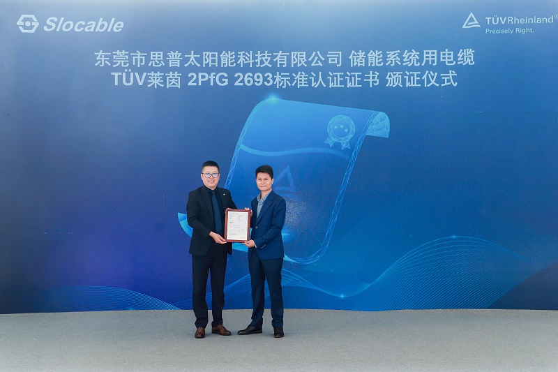 On April 11, 2024, TÜV Rheinland issued the latest version of the energy storage cable 2PfG 2693/03.23 standard certification to Dongguan Slocable Solar Technology Co., Ltd. at the 12th Energy Storage International Summit and Exhibition (ESIE 2024). Shi Bing, General Manager of TÜV Rheinland Solar and Commercial Products, Service Components and Components, and Wan Neng, Slocable Solar Technology Manager, attended the certificate awarding ceremony.