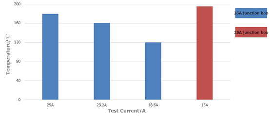 When a hot spot occurs in a photovoltaic module, the diode will conduct forward and generate heat. Take the 210 module and the 25A junction box as an example, when the output current Isc=18.6A (the current when the actual module is working is Imp≈17.5A), the junction temperature is about 120°C. Even considering a part of the environment with sufficient light, in the case of 1.25 times Isc (23.2A), the junction temperature of the photovoltaic junction box at this time is about 160°C, which is far lower than the 200°C junction temperature upper limit of the IEC62790 standard. Of course, the Isc for modules 182 and 166 is slightly lower, and the junction box with the same configuration has lower heat generation, and the junction boxes are in a safe working state so there is no risk.