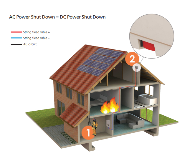 The Slocable firefighter safety switch provides a solution where firefighters disconnect the AC power circuit before putting out a fire so that they can start fighting the fire without the risk of electrocution. The fire safety switch detects grid failure and automatically turns off the isolator switch after 5 seconds, creating a safer environment for firefighters. (AC power off = DC power off automatically; automatic reset when AC power is restored = DC power recovery) The PV fireman’s safety switch system can be quickly, completely and remotely disconnected from a PV installation with a simple action on the control panel interface, and can even be remotely actuated over a mobile phone network. By disconnecting the PV installations, no DC power is conducted from the PV array, and the high-voltage DC power from the PV modules will be completely isolated, which provides safe conditions for firefighters to extinguish fires and enter the building.