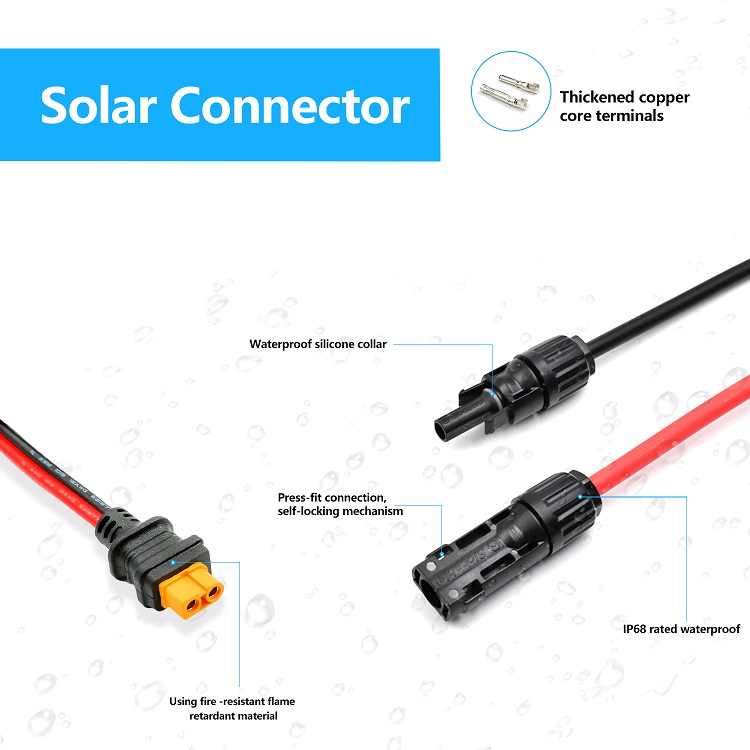 The MC4 and XT60 connectors also feature gold-plated contacts for excellent electrical conductivity and corrosion resistance, ensuring a secure connection even under harsh environmental conditions.