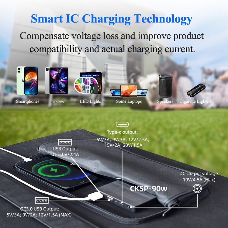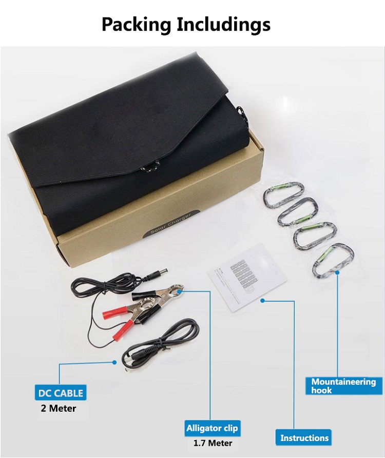 1.Open and put the folded panel, face the sunlight vertically. Do not block the panel or under the shadow.